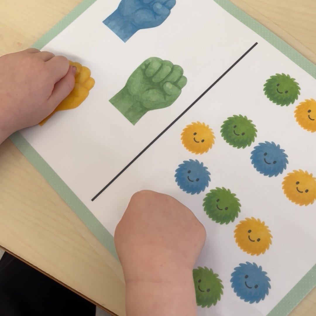 👉 Al mismo tiempo, con la mano izquierda, tocamos el color de la pelusa usando puño o palma.