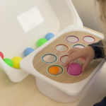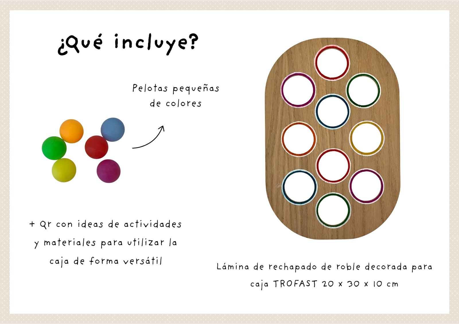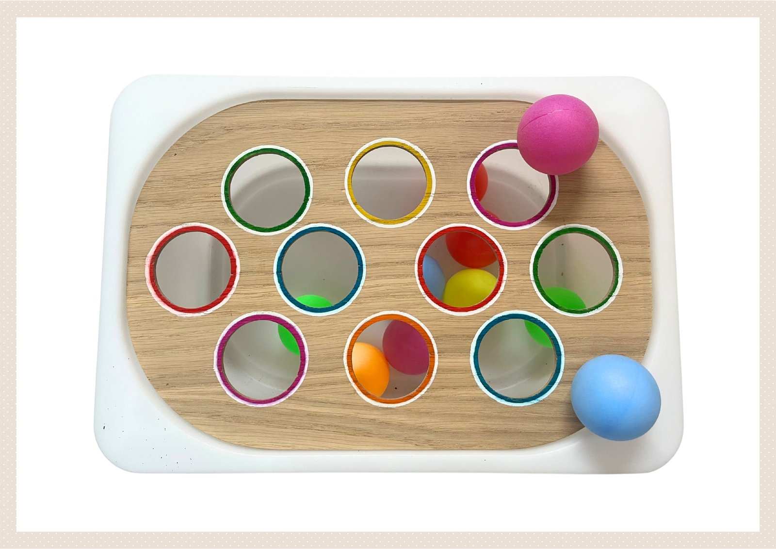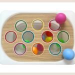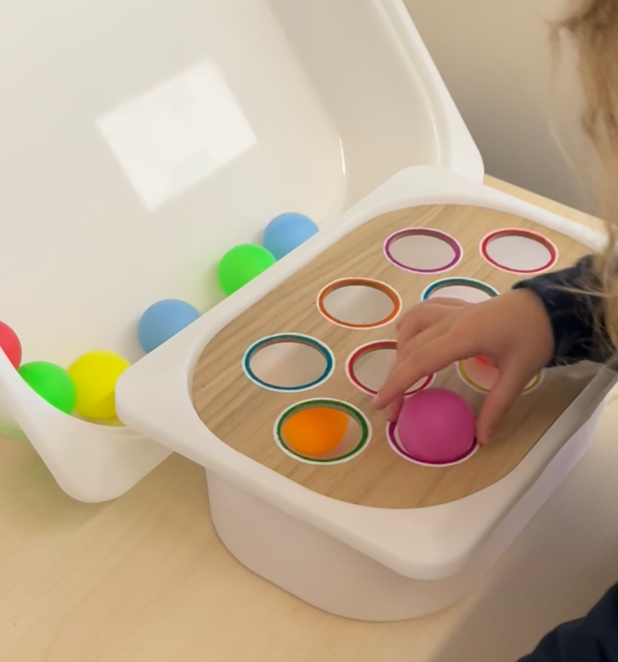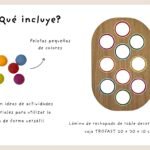 Un tablero diseñado siguiendo el método TEACCH para fomentar la coordinación óculo-manual a través del encaje de pelotas en su color correspondiente. Se trata de una actividad estructurada, con un funcionamiento sencillo y predecible, lo cuál aporta seguridad en los peques.
