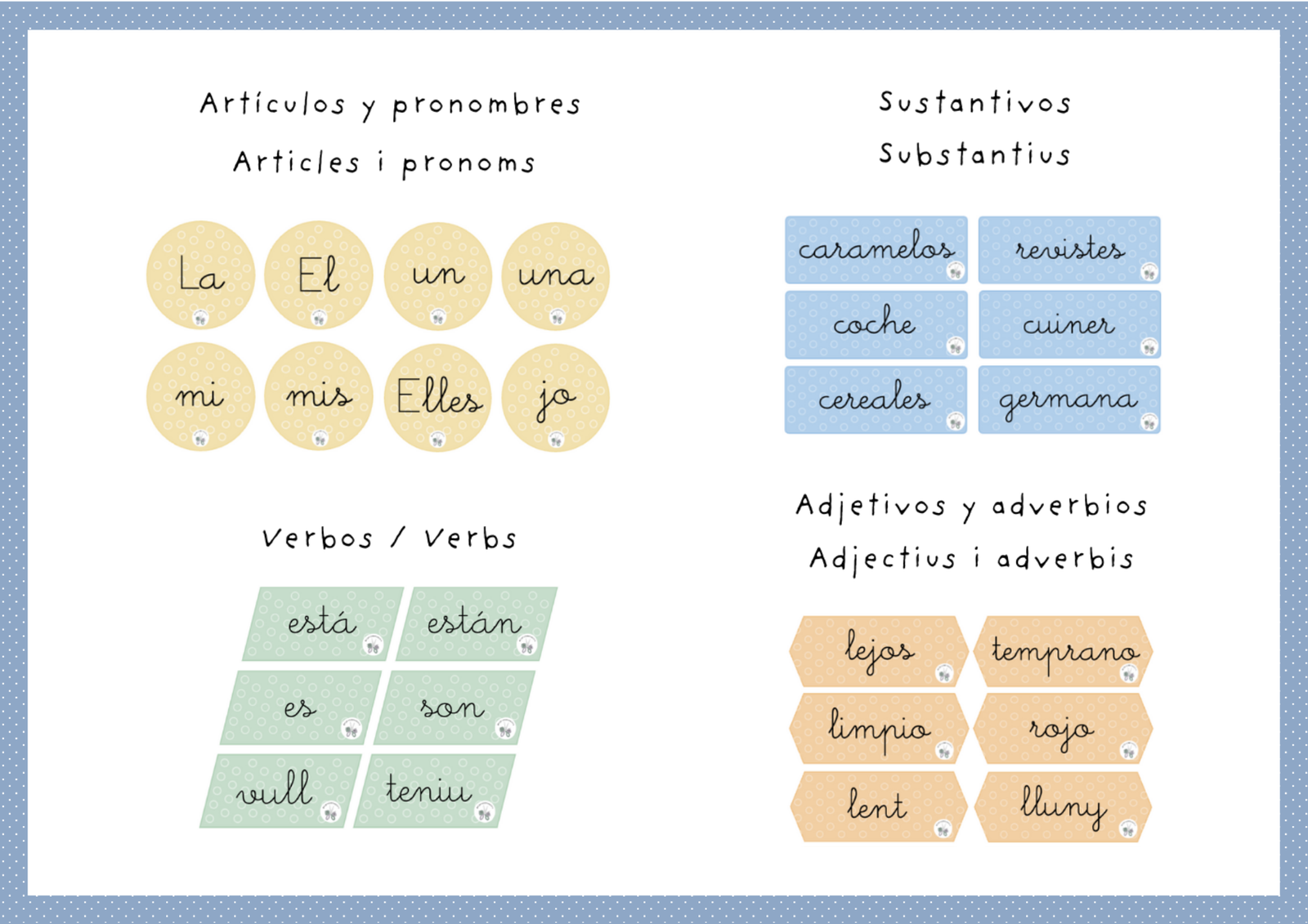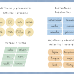 🗂️ Contiene 10 hojas con los principales elementos gramaticales —artículos, pronombres, sustantivos, verbos, adjetivos y adverbios.