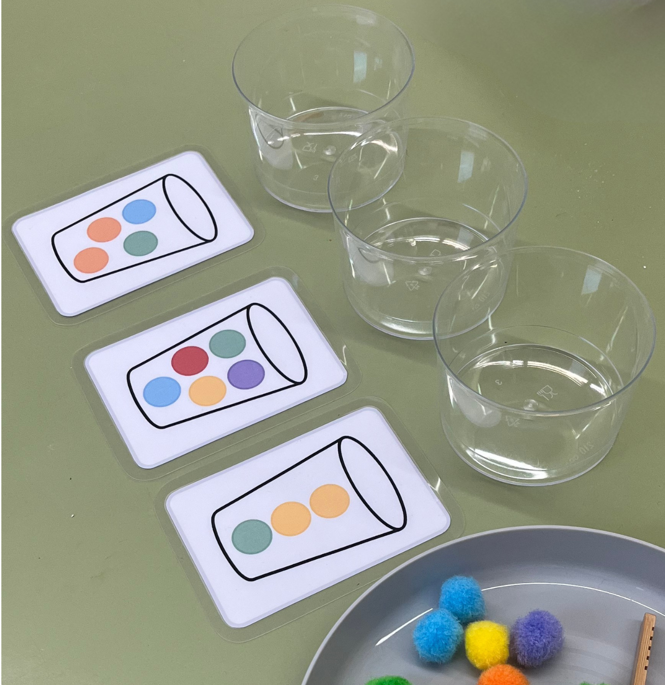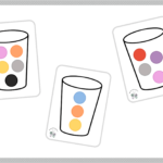 Los niños deben usar pinzas para colocar pompones dentro de vasos, siguiendo el modelo de las láminas.